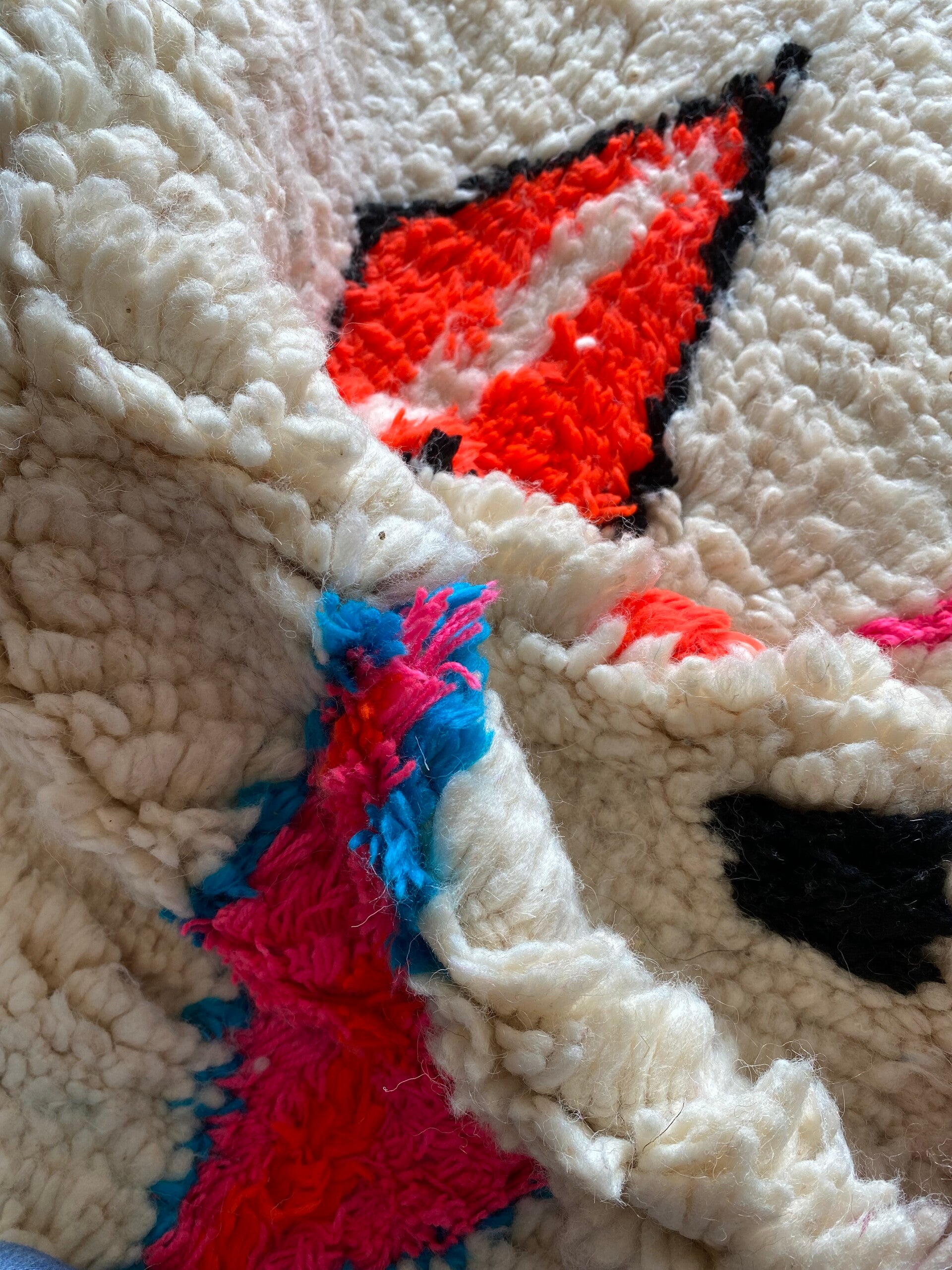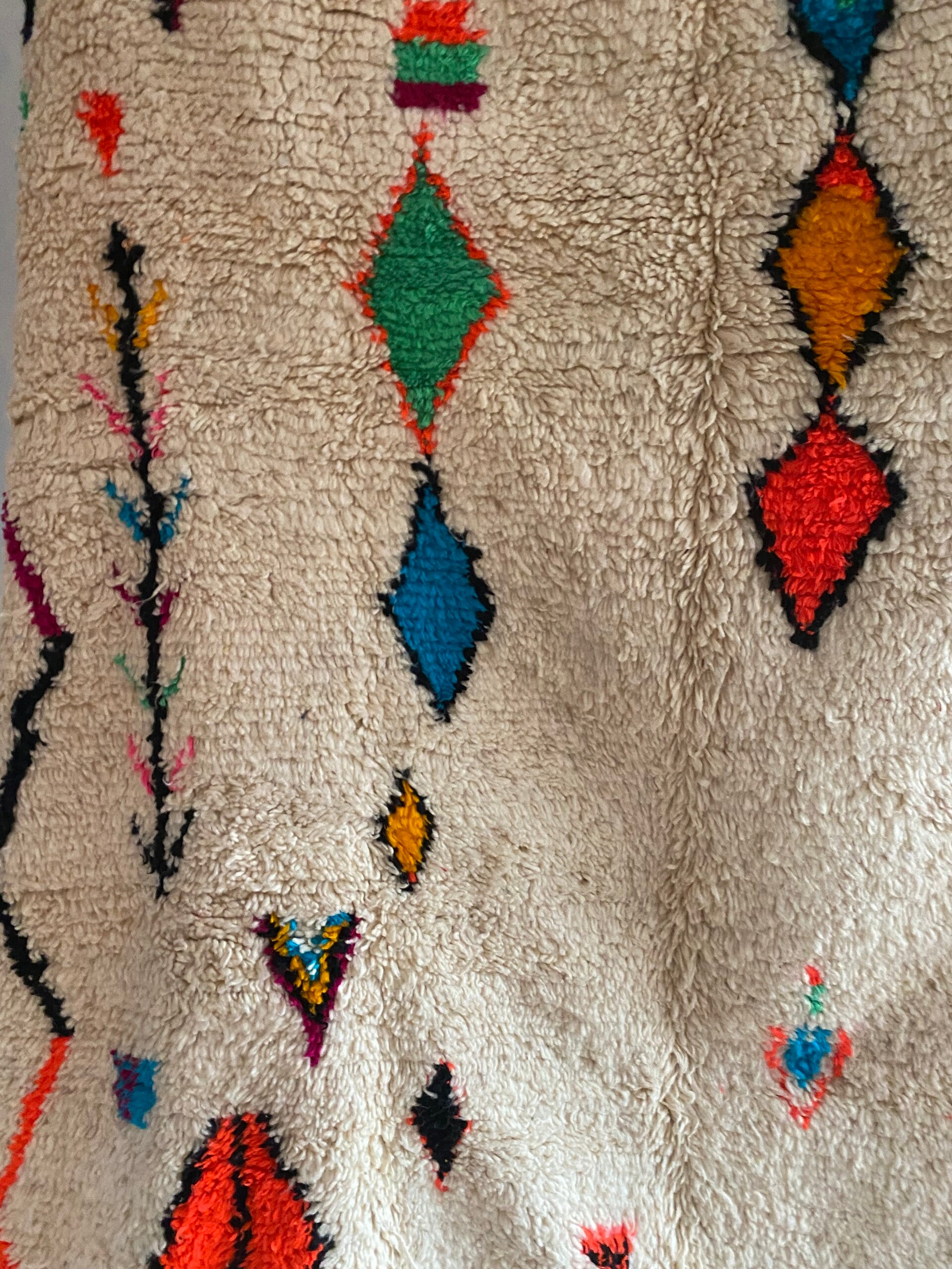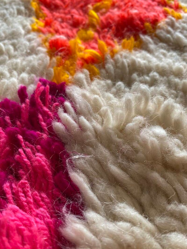 Alle MissNomad vintage vloerkleden zijn unieke stukken! Ik was dan ook meteen op slag verliefd op deze Azilal. Door de prachtige felle kleuren is het een echte Eye catcher voor in huis! Het vloerkleed is prachtig afgewerkt, een uniek fantastisch exemplaar! Zelfs de achterkant is zo prachtig om te zien.