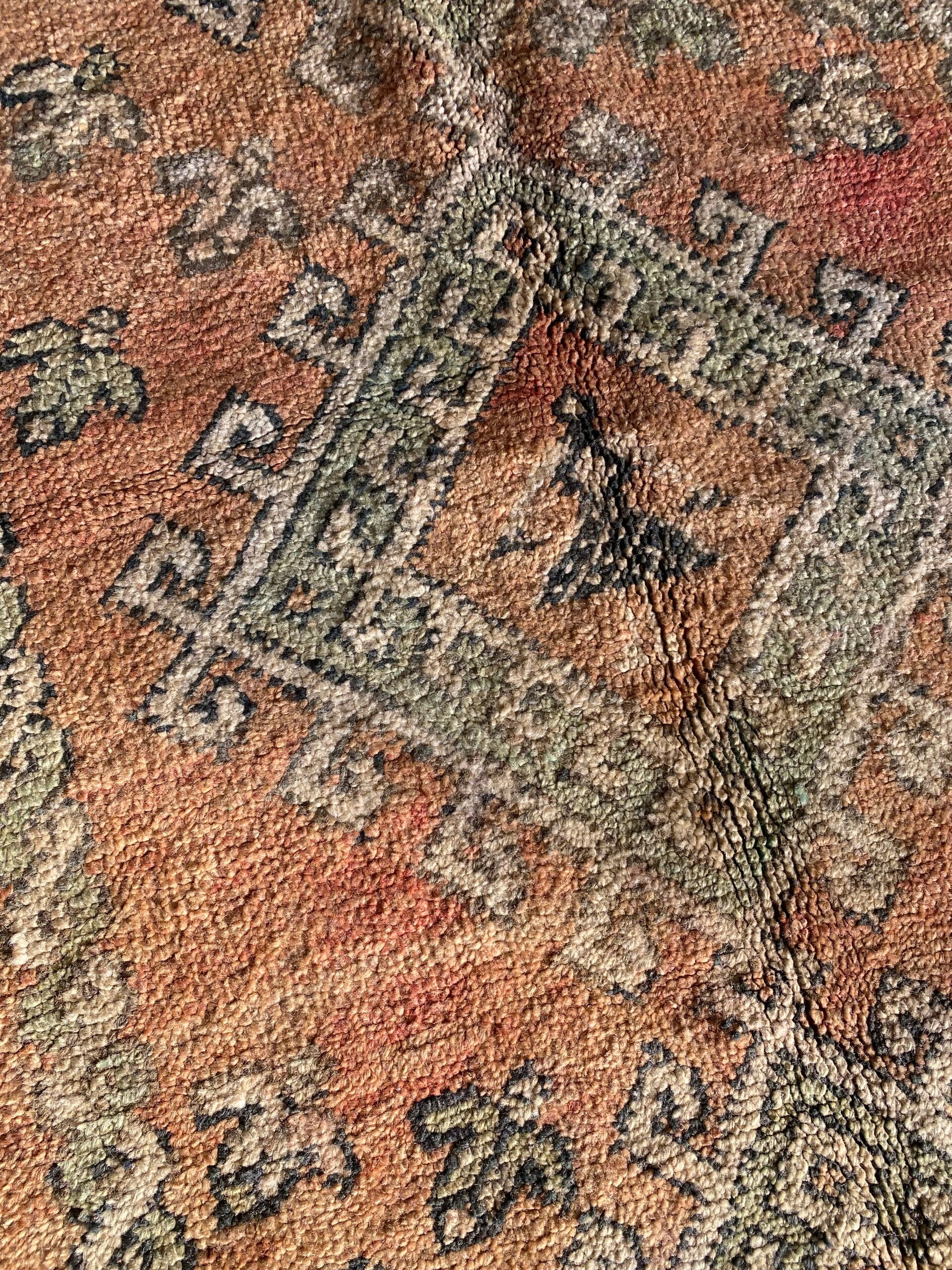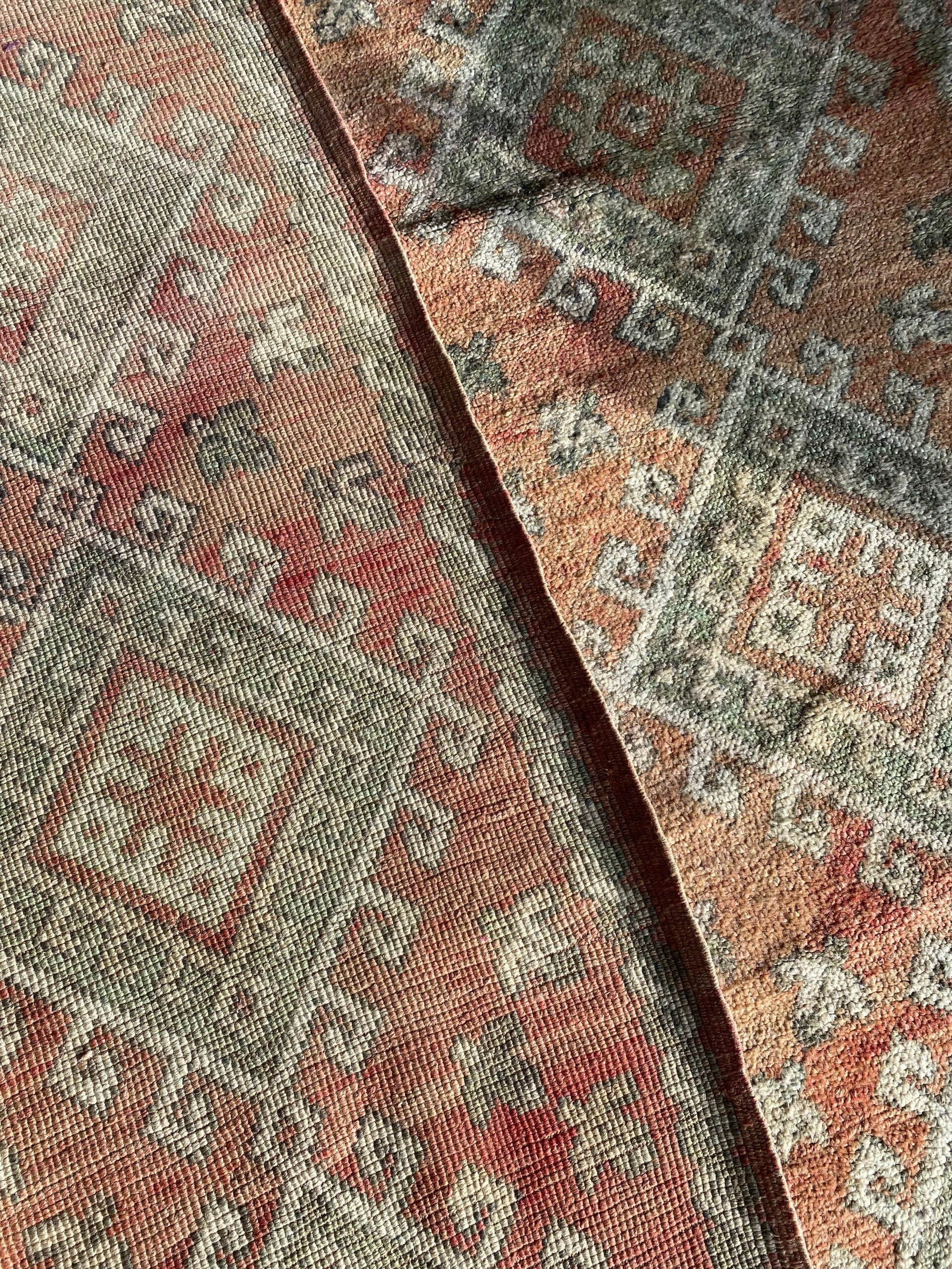 Wat een geweldig mooi vintage Beni M'Guild vloerkleed is dit!Alle MissNomad vloerkleden zijn unieke stukken..ik was dan ook meteen op slag verliefd op deze,door de prachtige peachy kleur nuances met prachtige authentieke versieringen is het een echte eye cather voor in huis!Het vloerkleed is platgeweven maar erg zwaar,dus het valt lekker zwaar op de vloer.