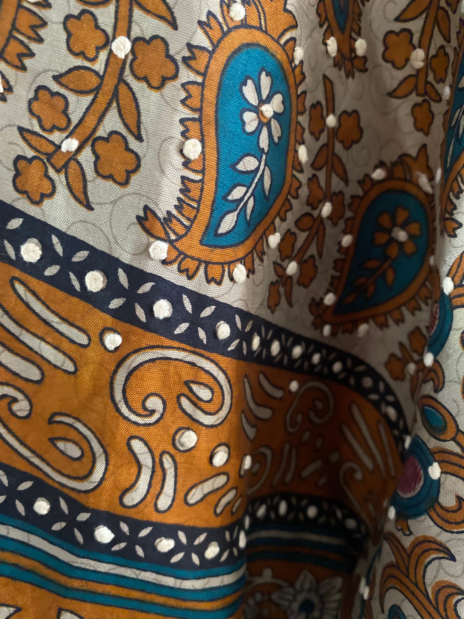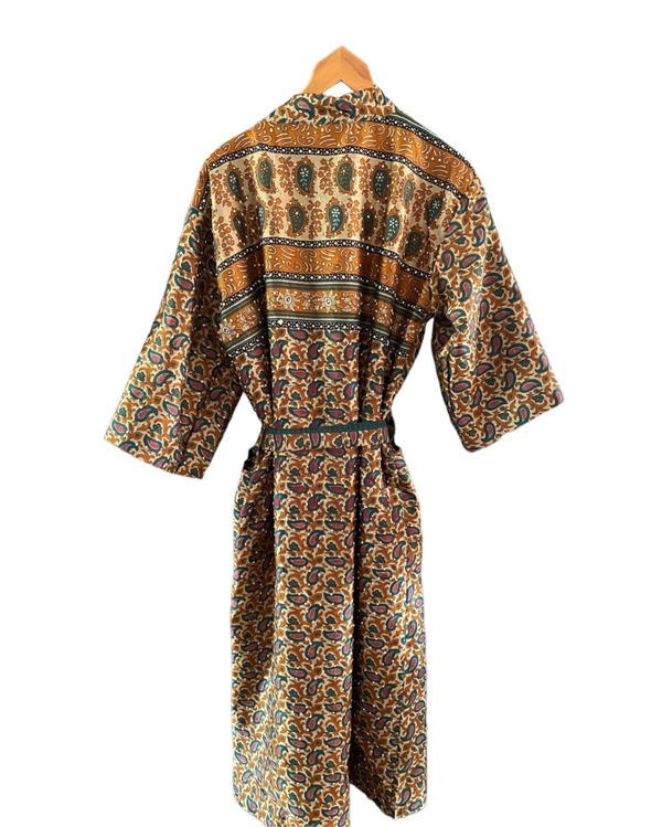 De kimono's zijn gemaakt van upcycled Sari zijden en af en toe met een beetje nylon. Van elke kimono is er maar één gemaakt. En de vrolijke motieven maken deze kimono's zo speciaal en uniek.Je zult verrast zijn als je het aan hebt!
