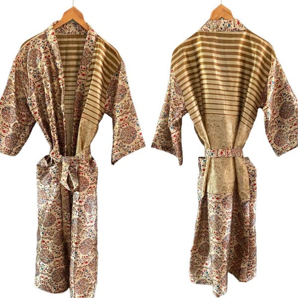 De kimono's zijn gemaakt van upcycled Sari zijden en af en toe met een beetje nylon. Van elke kimono is er maar één gemaakt. En de vrolijke motieven maken deze kimono's zo speciaal en uniek.Je zult verrast zijn als je het aan hebt!