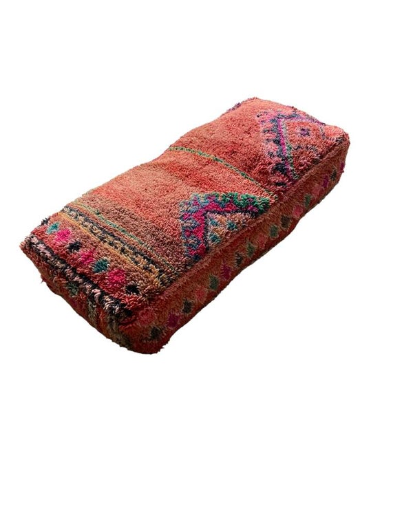 Beni Mguild vintage berber XL-vloerkussens zijn tussen de 30-40 jaar oud afkomstig uit het hoge Atlasgebergte van Marokko.Een prachtig item met een tweede leven voor wat ooit met de hand is geweven en geknoopt en nu vermaakt is tot prachtige unieke poef