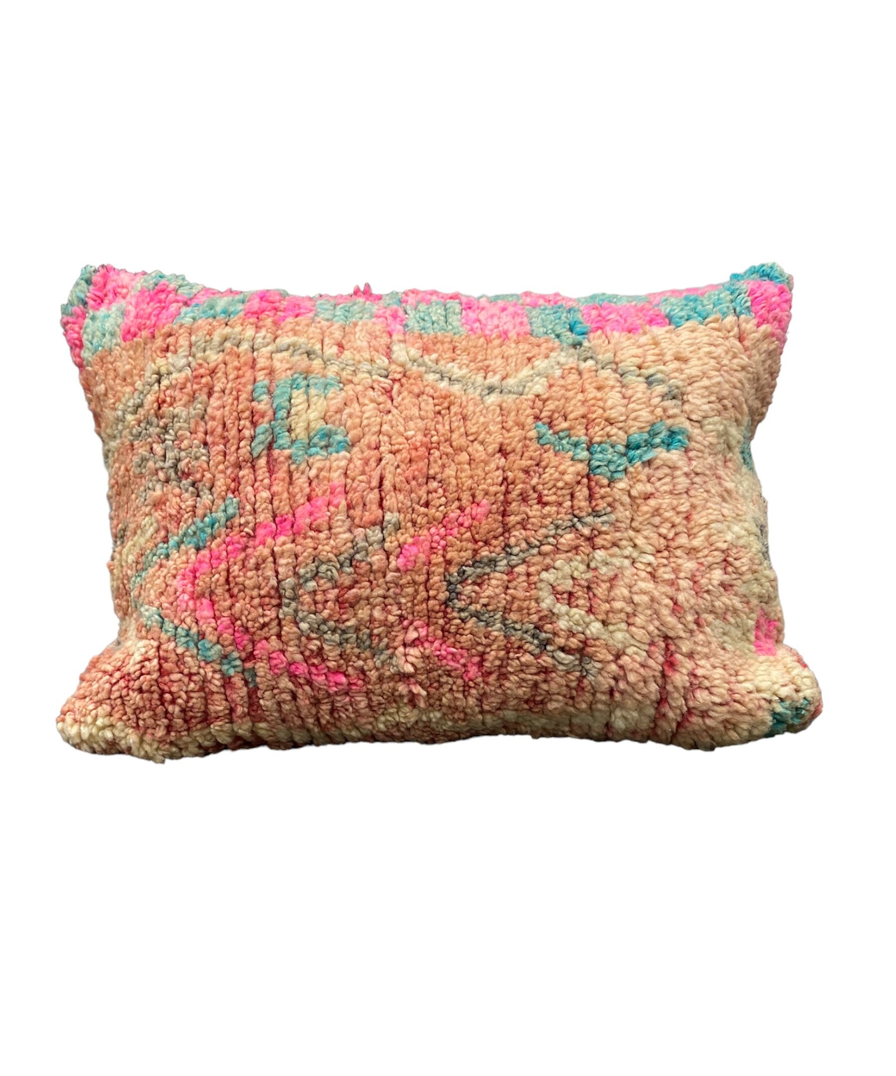 Prachtig versierd kussen speciaal gemaakt voor Missnomad van resten boujaad vloerkleden.De kleur en het patroon is toch geweldig!!Inclusief binnenkussen.Gemaakt in Marokko van vintage Boujaad kleden.