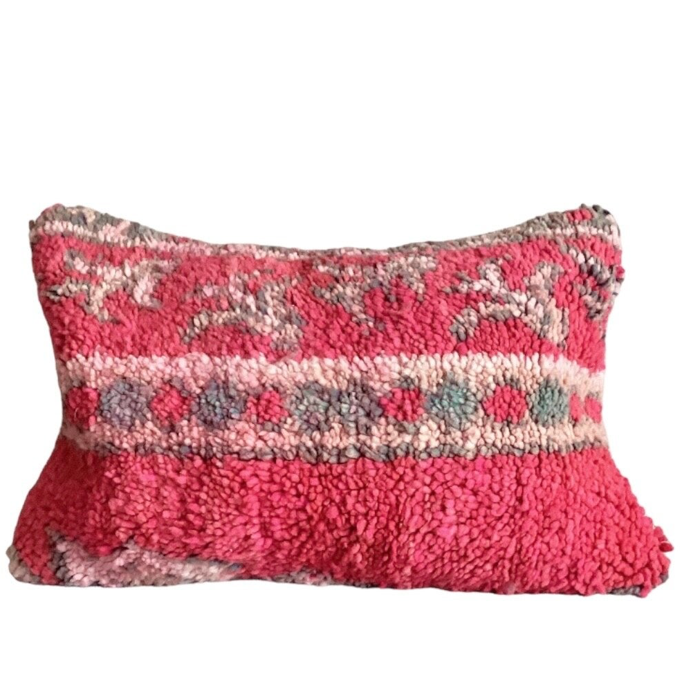 Prachtig versierd kussen speciaal gemaakt voor Missnomad van resten boujaad vloerkleden.De kleur en het patroon is toch geweldig!!Inclusief binnenkussen.Gemaakt in Marokko van vintage Boujaad kleden.Met super leuke kelim achterkanten,leuk om nog eens om te draaien.Ik heb verschillende kussens uit een vintage vloerkleed laten maken dus er zijn meerdere zoals deze te mixen met elkaar.