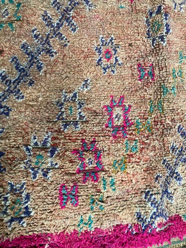 Wat een geweldig mooi vintage Beni M'Guild vloerkleed is dit!Alle MissNomad vloerkleden zijn unieke stukken..ik was dan ook meteen op slag verliefd op deze,door de peachy kleur nuances en de fuchsia roze rand is het een echte eye cather voor in huis!
