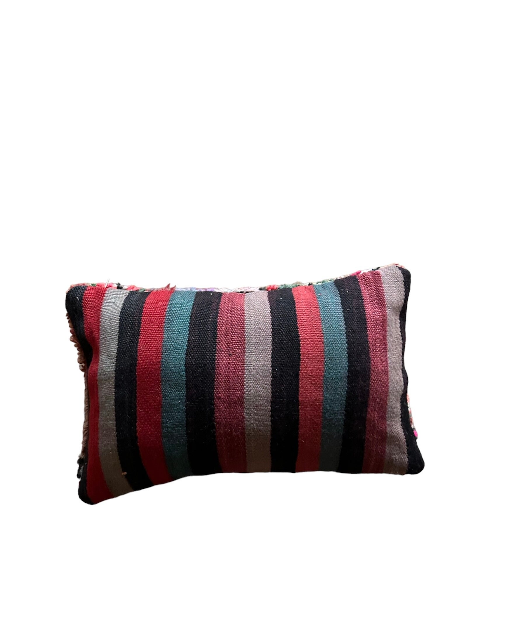 Prachtig versierd kussen speciaal gemaakt voor Missnomad van resten boujaad vloerkleden.De kleur en het patroon is toch geweldig!!Inclusief binnenkussen.Gemaakt in Marokko van vintage Boujaad kleden.Met super leuke kelim achterkanten,leuk om nog eens om te draaien.Ik heb verschillende kussens uit een vintage vloerkleed laten maken dus de achterkanten verschillen nog wel eens.