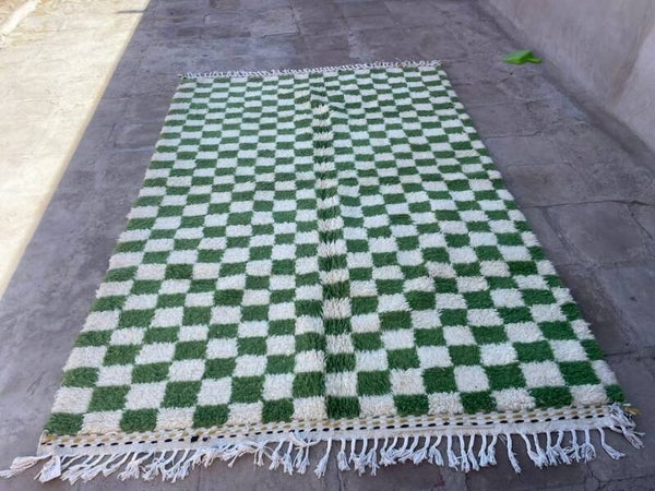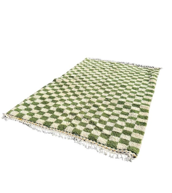Dit geruite groene tapijt afgewerkt met beige/witte wol is een waanzinnige eyecatcher in ieder interieur. De kleur is zo mooi groen geweven en een uniek exemplaar.Dit tapijt is de perfecte combinatie tussen Marokkaans vakmanschap en eigentijds design. Dit ruit tapijt is traditioneel geknoopt met niets anders dan dik wol.Om de kwaliteit en de zachtheid te behouden, wordt het vloerkleed traditioneel gewassen met zeep en vervolgens gedroogd in de zon. Dit proces zorgt voor een aangename en zachte textuur.