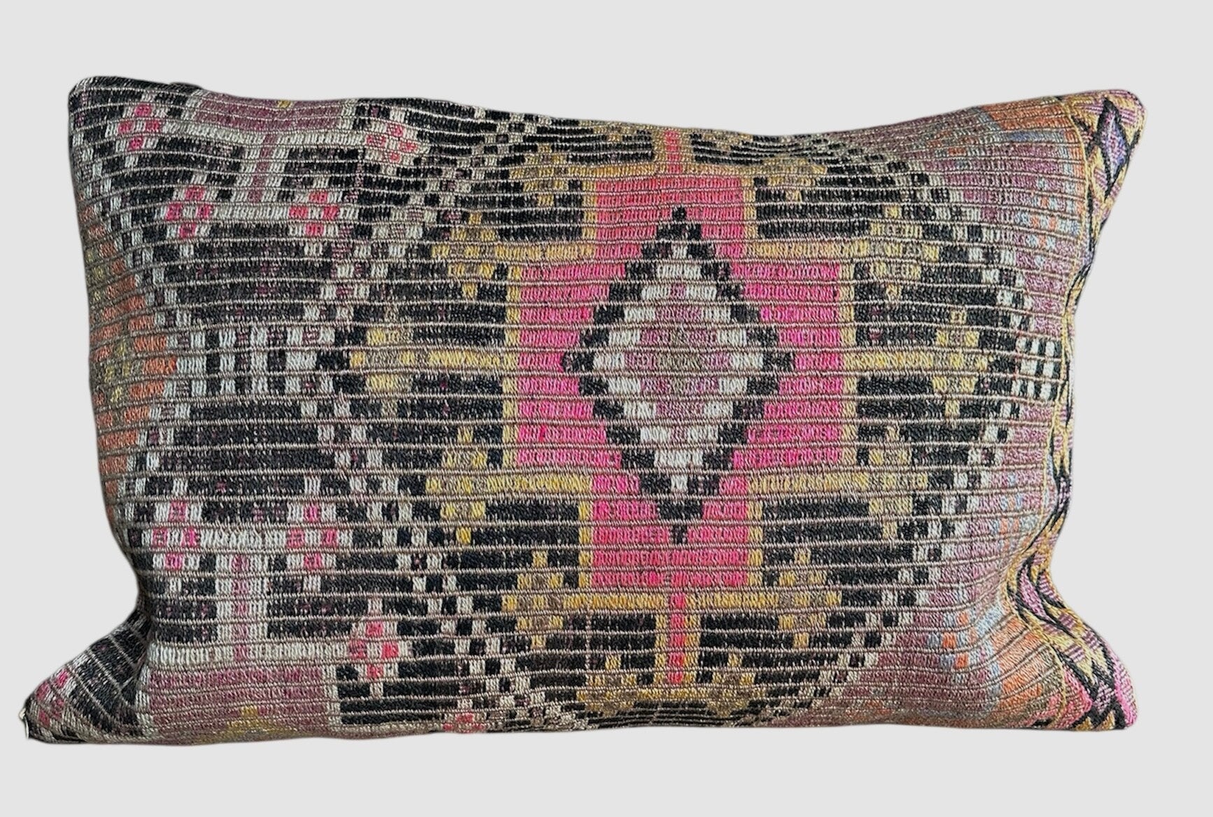 Super mooie roze kelim en donkere details 40x65 voor in een loungebank of mooie fauteuil en erg leuk te mixen met de andere kelim kussens voor in je interieur of onder de overkapping buiten.