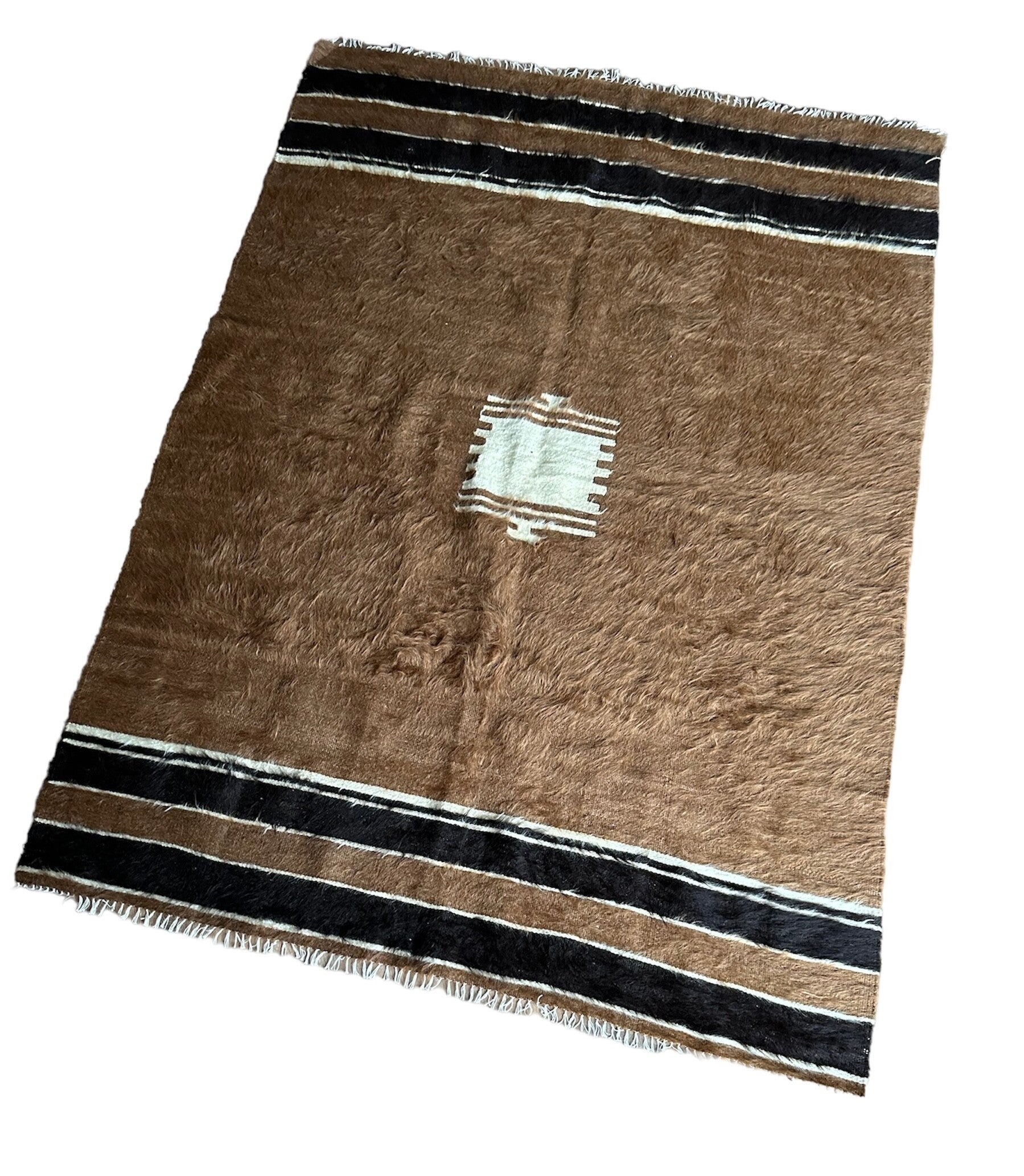De zachte vacht van deze mooie geiten wordt met de hand gekamd of geschoren en na het wassen gesponnen tot garen waar ze daarna deze prachtige kleden van maken voor mij! Uniek en er is er maar een van geweven!