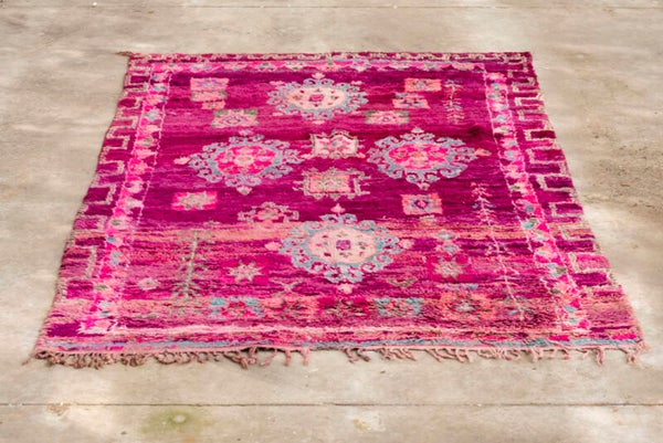 Breng karakter en warmte in je interieur met dit prachtige vintage vloerkleed! Dit authentieke Marokkaanse tapijt is met de hand geweven en heeft een betoverend patroon in rijke tinten roze en rood. De verweerde uitstraling en unieke details geven het kleed een verhaal – een tijdloos stukje vakmanschap dat perfect past in zowel een bohemian als modern interieur.