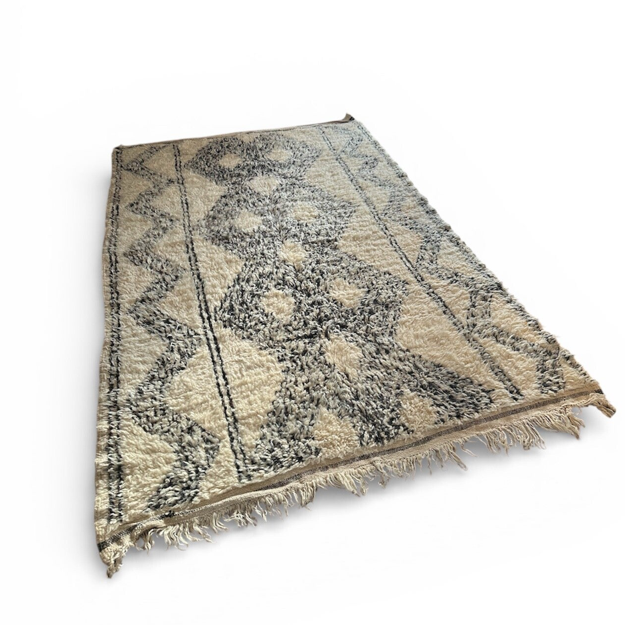 Uniek berber vloerkleed met mooi rustig grafisch patroon.Je hebt hier niet zomaar een kleed in huis maar ook een stukje geschiedenis met een eigen levensverhaal.
