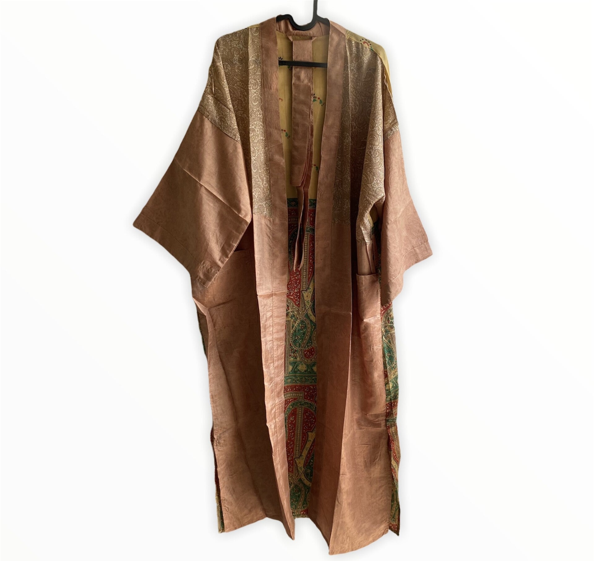 De kimono's zijn gemaakt van upcycled Sari zijden en af en toe met een beetje nylon. Van elke kimono is er maar één gemaakt. En de vrolijke motieven maken deze kimono's zo speciaal en uniek.Je zult verrast zijn als je het aan hebt!