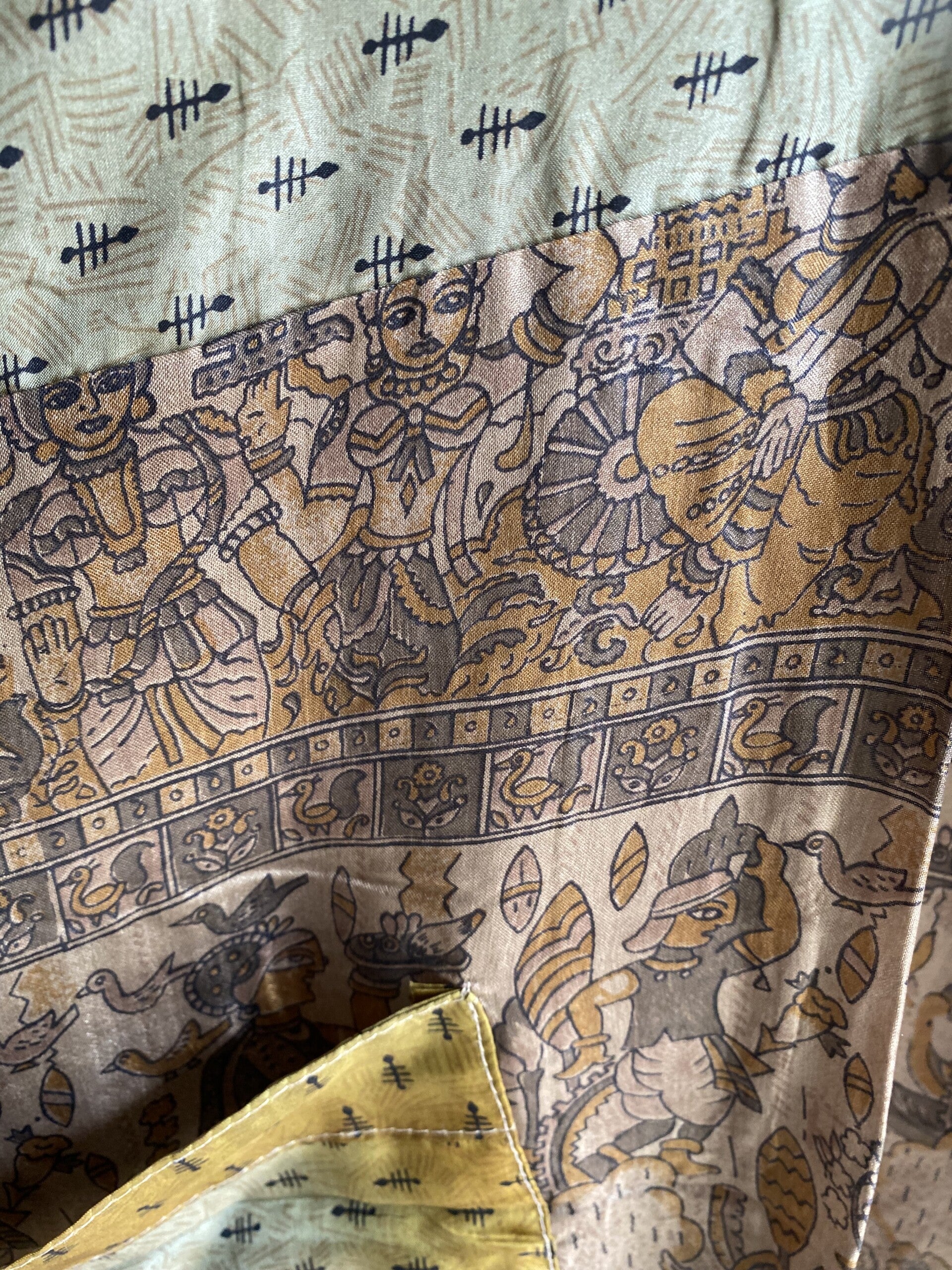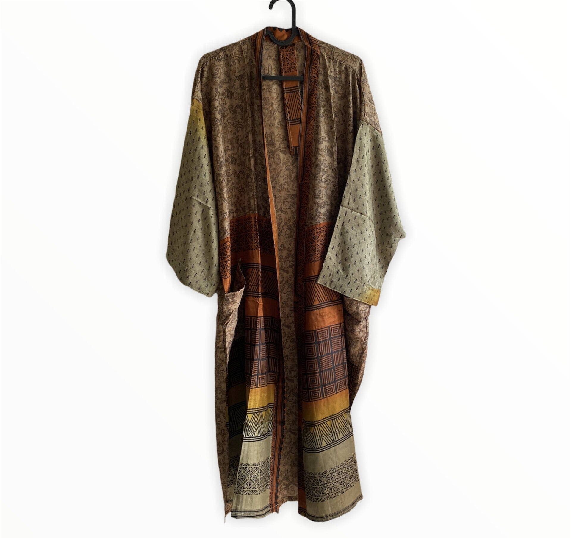 De kimono's zijn gemaakt van upcycled Sari zijden en af en toe met een beetje nylon. Van elke kimono is er maar één gemaakt. En de vrolijke motieven maken deze kimono's zo speciaal en uniek.Je zult verrast zijn als je het aan hebt!