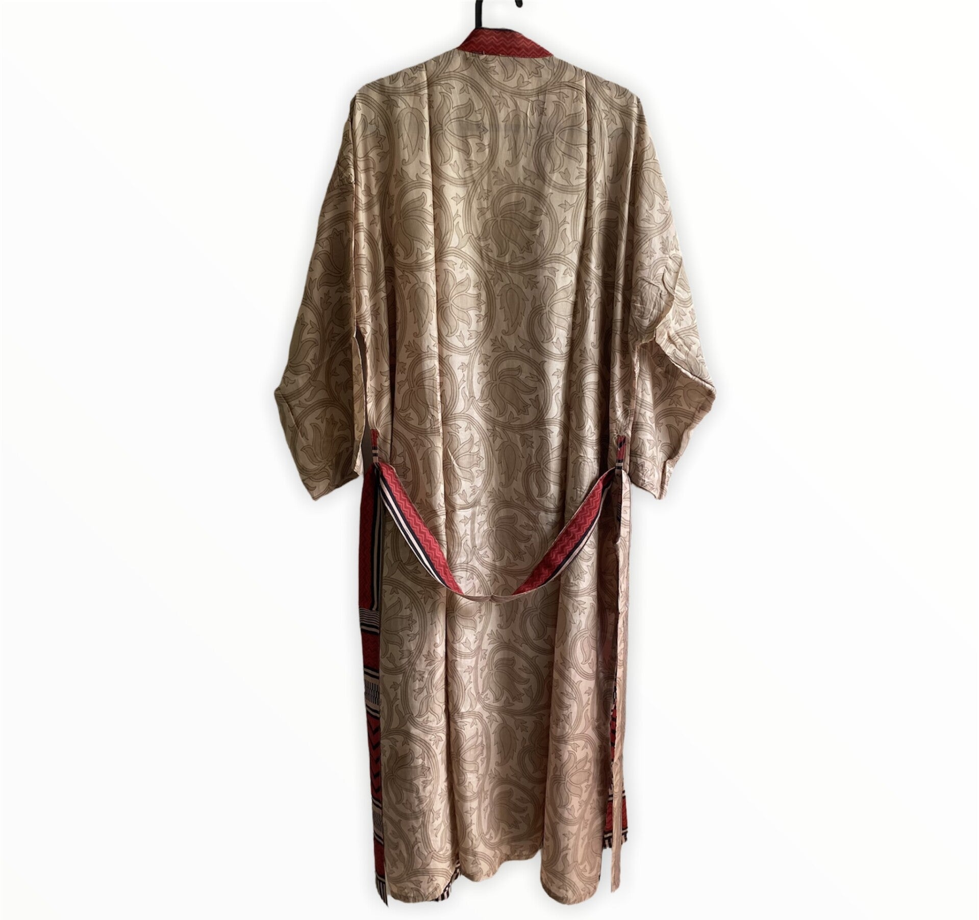 De kimono's zijn gemaakt van upcycled Sari zijden en af en toe met een beetje nylon. Van elke kimono is er maar één gemaakt. En de vrolijke motieven maken deze kimono's zo speciaal en uniek.Je zult verrast zijn als je het aan hebt!