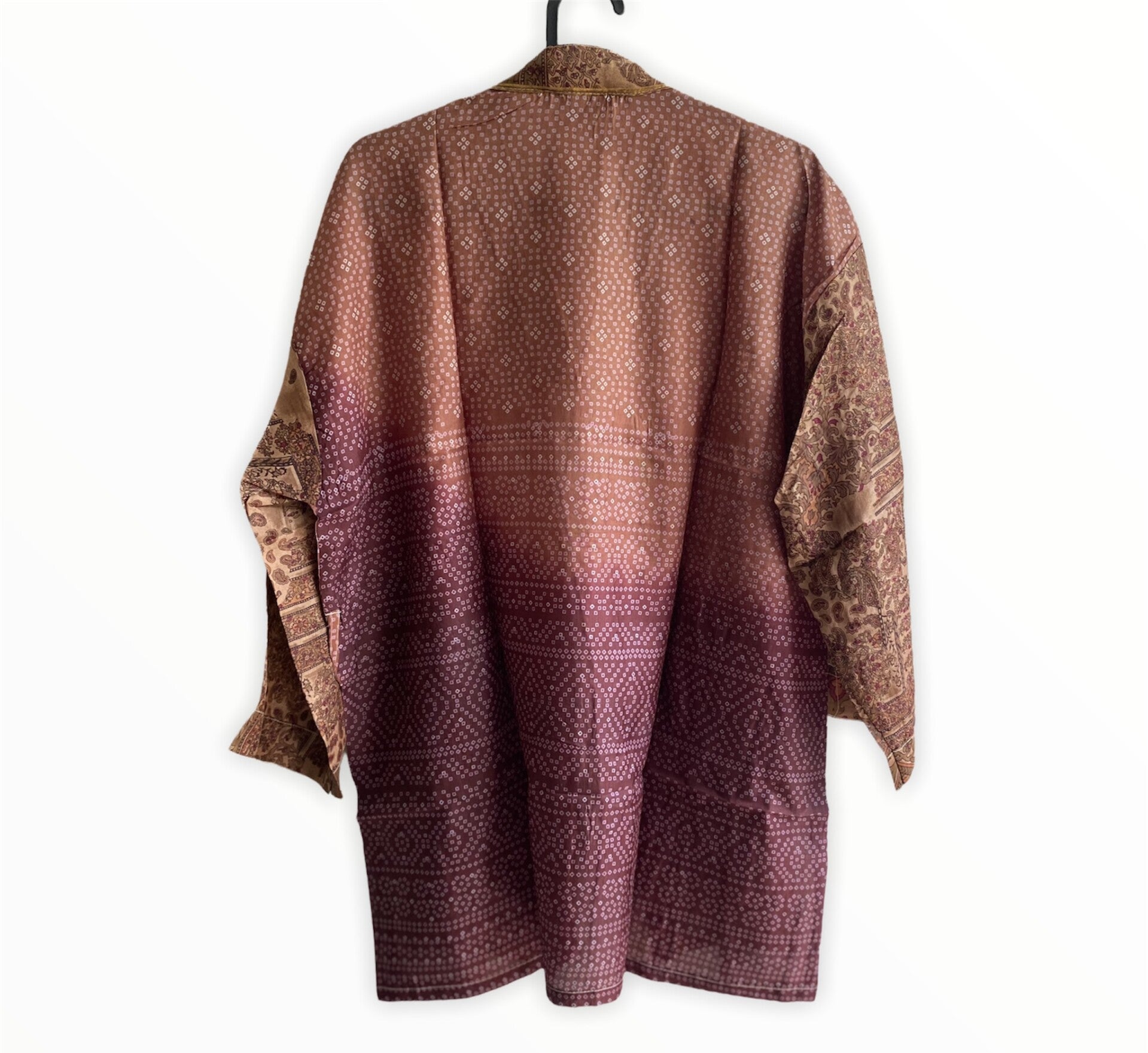 De kimono's zijn gemaakt van upcycled Sari zijde en af en toe met een beetje nylon. Van elke kimono is er maar één gemaakt. En de vrolijke motieven maken deze kimono's zo speciaal en uniek.Je zult verrast zijn als je het aan hebt!