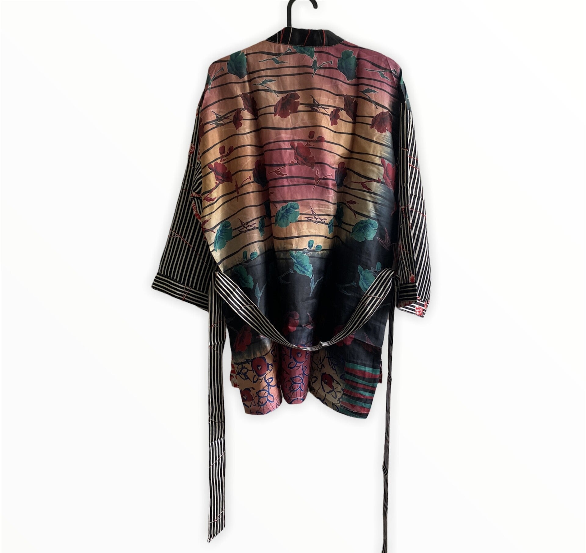 De kimono's zijn gemaakt van upcycled Sari zijde en af en toe met een beetje nylon. Van elke kimono is er maar één gemaakt. En de vrolijke motieven maken deze kimono's zo speciaal en uniek.Je zult verrast zijn als je het aan hebt!