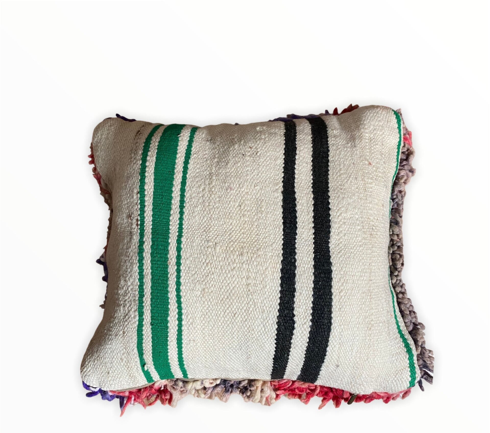 Prachtig versierd kussen speciaal gemaakt voor Missnomad van resten boujaad vloerkleden.De kleur en het patroon is toch geweldig!!De kelim achterkant..de verassing (echt prachtig)Inclusief binnenkussen.Gemaakt in Marokko van vintage Boujaad kleden.