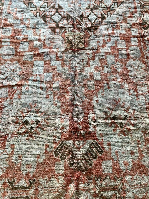 Een prachtig handgeweven Marokkaanse Boujaad tapijt.In heerlijke kleuren combinatie en prachtig versierd.Dit vintage tapijt is hand geweven door berber vrouwen in het Atlas gebergte van Marokko en zo'n 35 jaar een echte beauty.