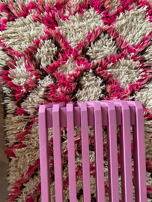Alle MissNomad vintage vloerkleden zijn unieke stukken! Ik was dan ook meteen op slag verliefd op deze vintage Boujad. Door de prachtige roze kleur is het een echte Eye catcher voor in huis! Het vloerkleed is prachtig afgewerkt, een uniek fantastisch exemplaar! Zelfs de achterkant is zo prachtig om te zien.